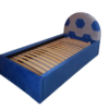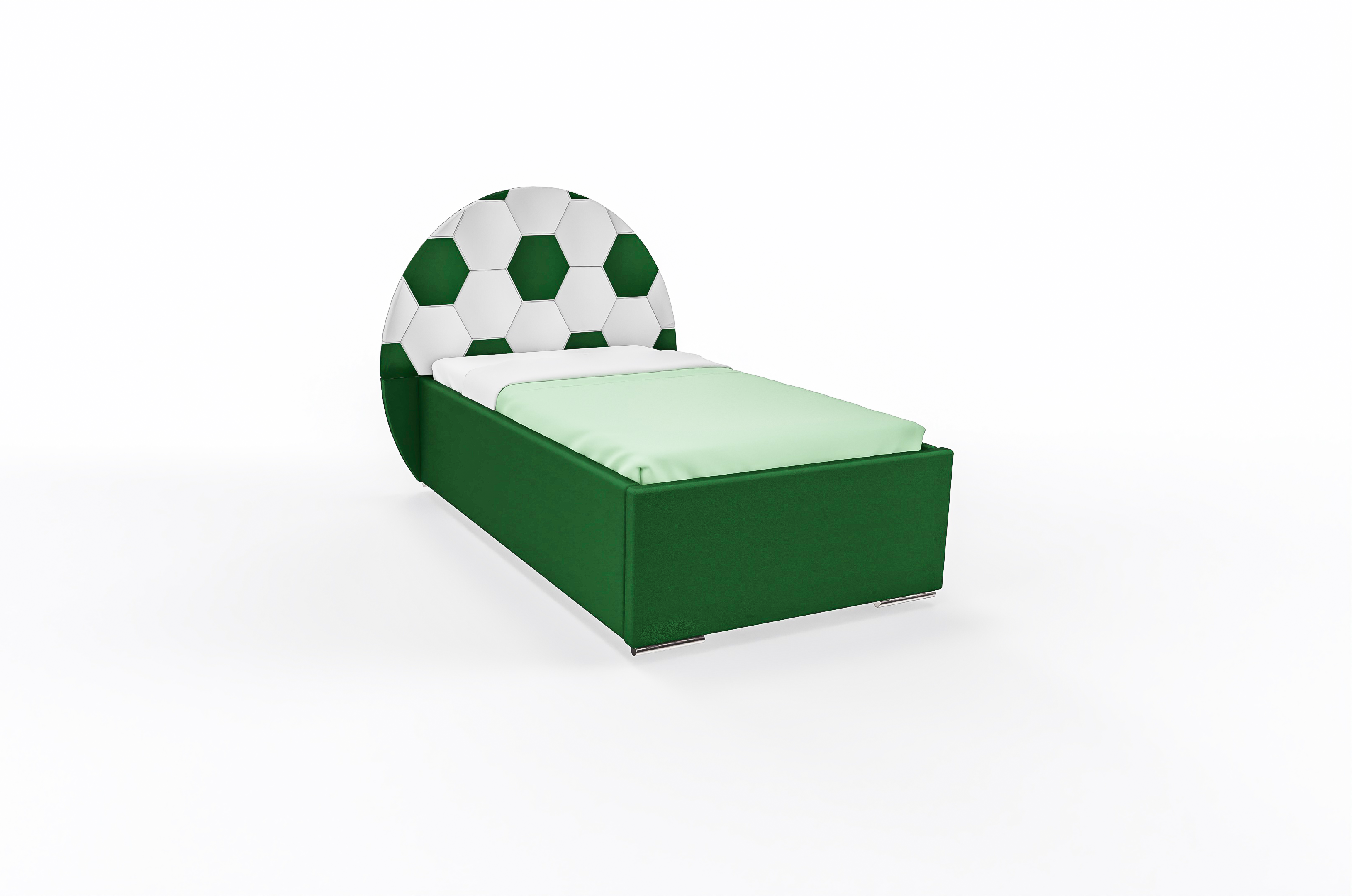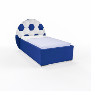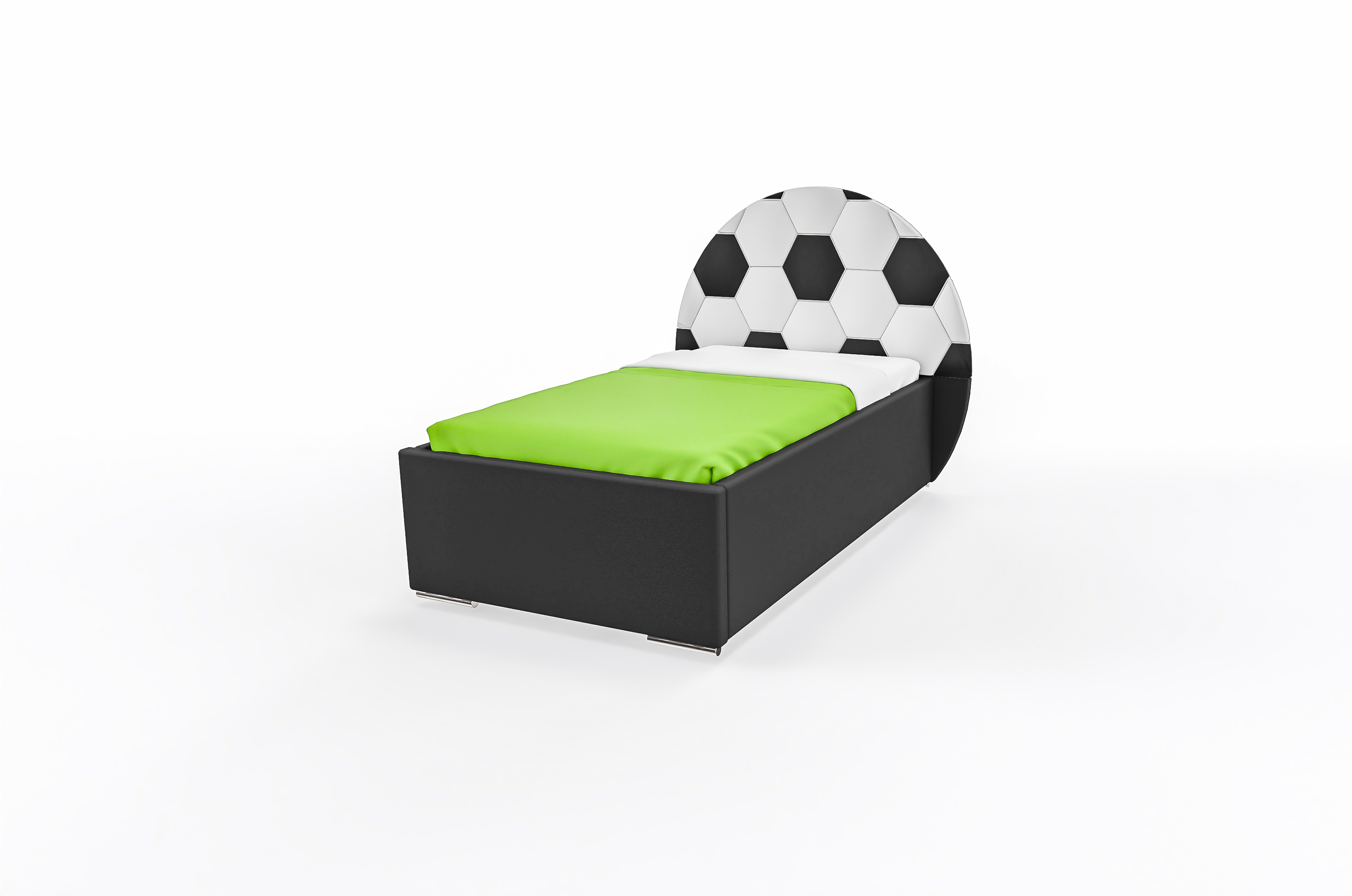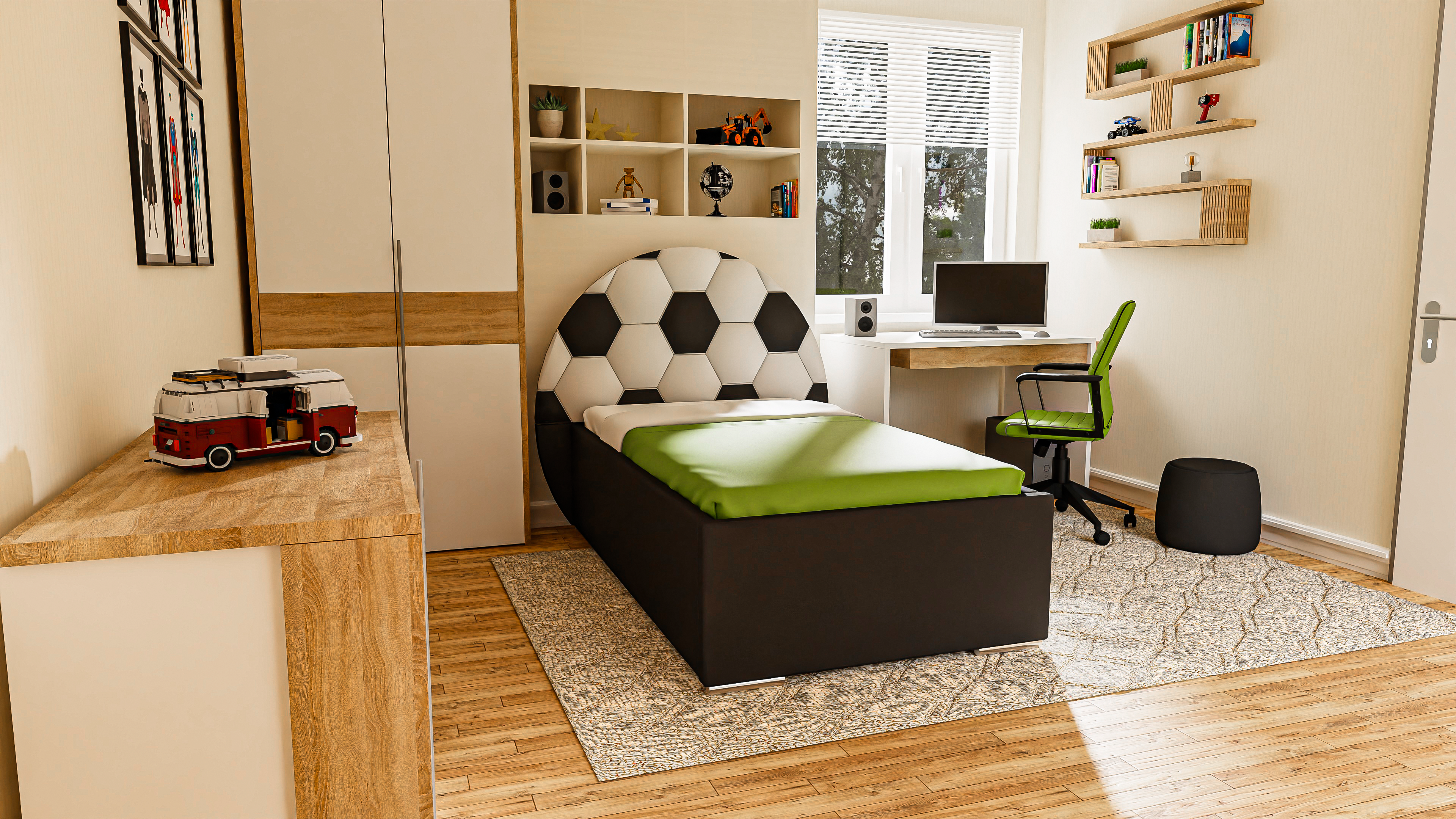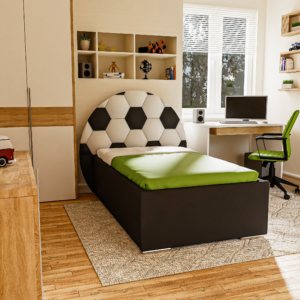Łóżko sypialniane tapicerowane dla chłopca z efektownym zagłówkiem w kształcie piłki. Idealne do pokoju małego fana piłki nożnej.