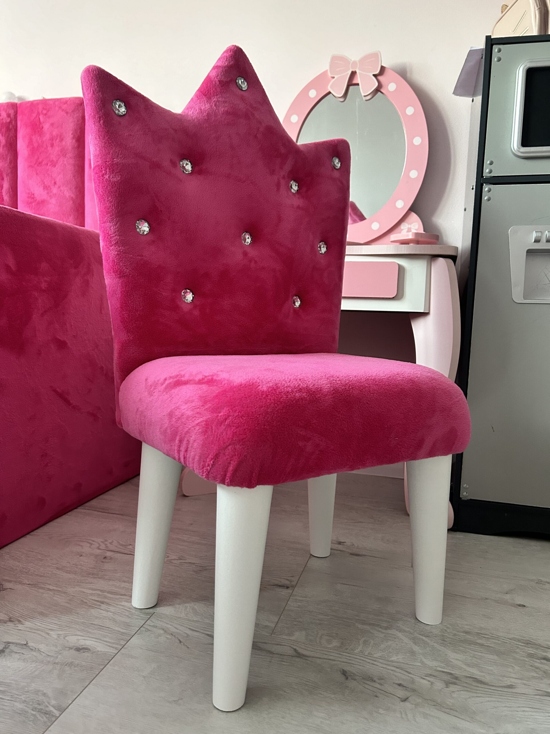 Cudne krzesełko dla małej księżniczki ,Idealnie sprawdzi się do stolika czy toaletki. Krzesełko jest nie tylko świetną ozdobą pokoju, dzięki możliwości wyboru tkaniny możesz dopasować do kolorystyki pokoju  , ale również dzięki miękkiemu oparciu  i siedzisku zapewni komfort podczas zabaw. Dedykowane jest dla dziecka do 6 lat