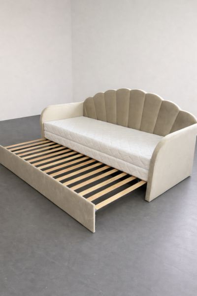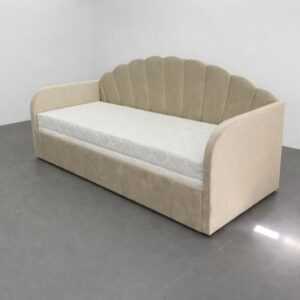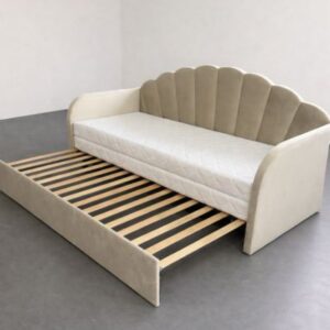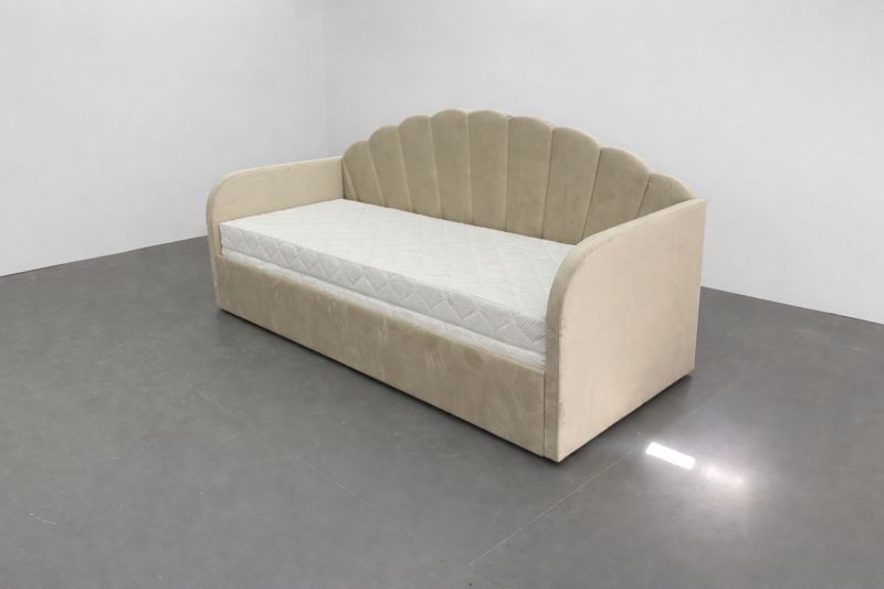 Łóżko tapicerowane dla dzieci w rozmiarze 200x80cm ( po wysunieciu 200×152)  – model LAURA z wysuwem na jednym poziomie  – w tkaninie Magic Velvet 2201 (kolor beżowy ).