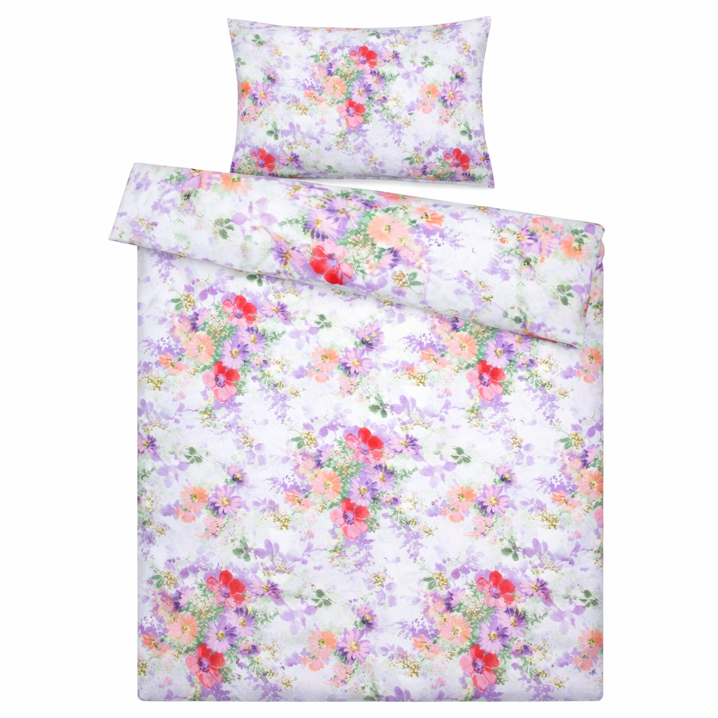 Romantyczna pościel w delikatny, pastelowy wzór kwiatowy na jasnym tle to idealny wybór do sypialni w stylu klasycznym, prowansalskim lub dziewczęcym. Subtelne odcienie fioletu, różu i czerwieni pięknie ożywiają wnętrze, nadając mu świeżości i lekkości.Idealna propozycja dla miłośników kwiatowych wzorów i subtelnej elegancji.