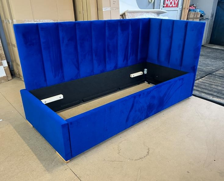 Łóżko tapicerowane dla dzieci w rozmiarze 180x90cm – model Robin – w tkaninie Magic Velvet 2296 (kolor granatowy). Dostępny od ręki.